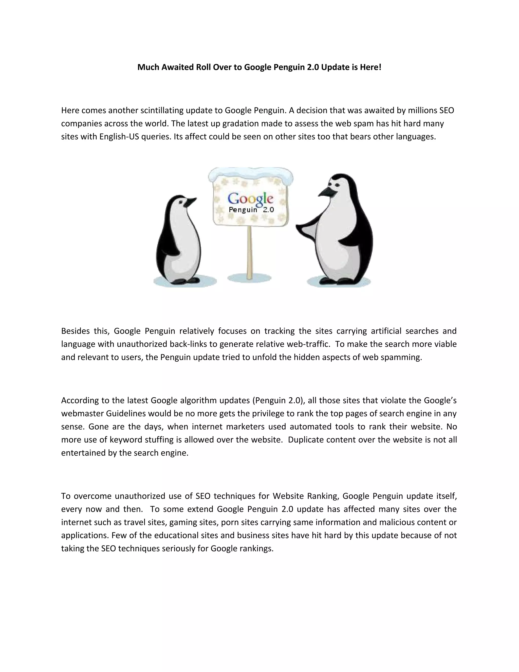Google has released an update to its Penguin algorithm called Penguin 2.0 that aims to crack down on websites using spammy techniques like unauthorized backlinks, duplicate content, and keyword stuffing to improve their search engine rankings. This update has negatively impacted many sites, including some travel, gaming, porn, and educational sites. Matt Cutts warned that Penguin 2.0 seems stricter than previous versions and will more strictly penalize websites using black hat SEO techniques. Google will now more closely inspect websites' content and on-page SEO to determine their true relevance and authority.