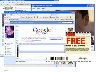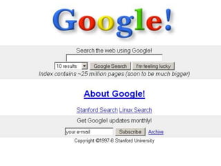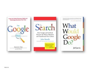 The document discusses whether Google is a friend or foe and examines some of the myths, math, and models surrounding Google in today's age of anxiety. It provides some key facts about Google, such as how it organizes the world's information and makes it accessible. It also discusses Google's PageRank algorithm and issues around search engine optimization. The document considers different perspectives on Google's use of data and algorithms to power its services and questions whether overreliance on data could paralyze decision making.