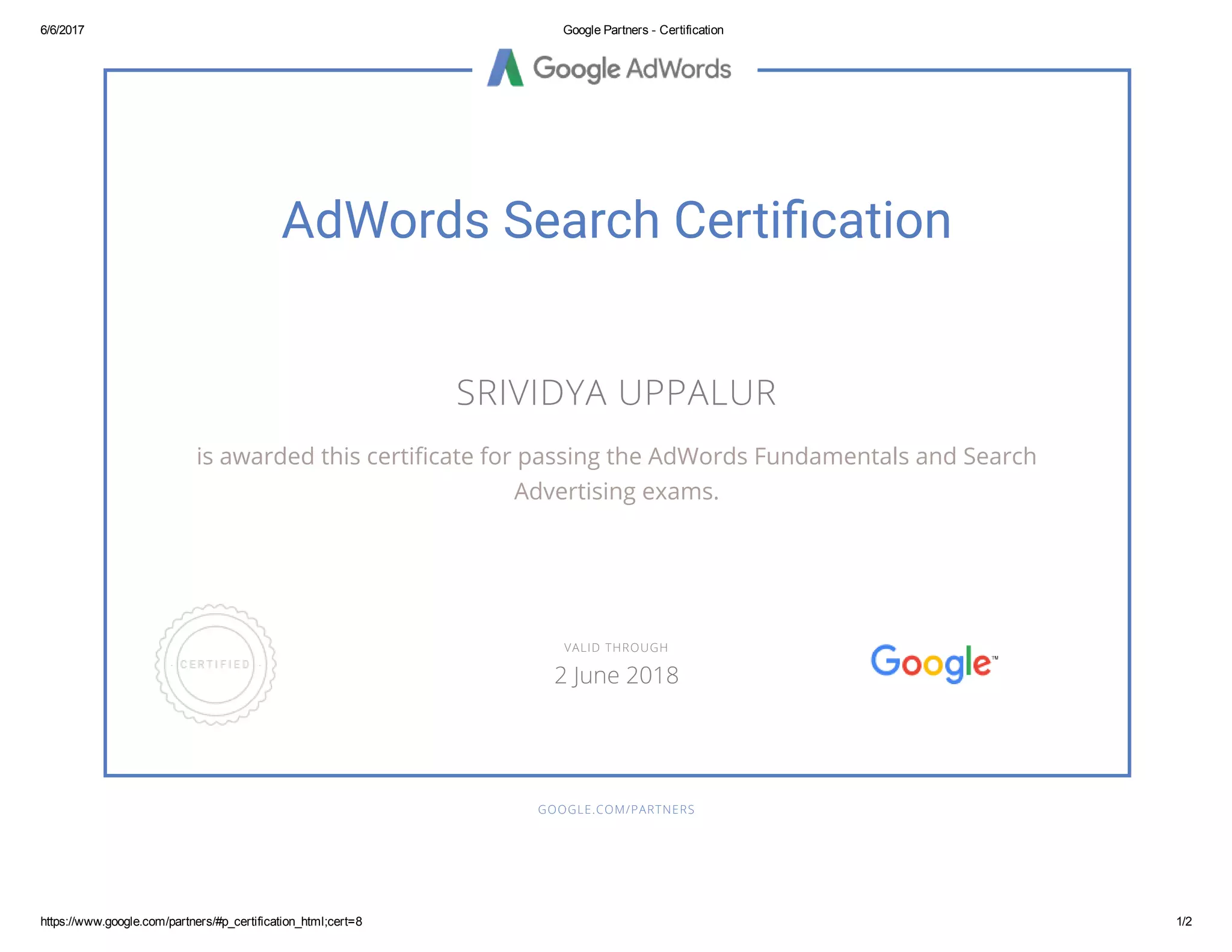 This certificate from Google awards Srividya Uppalur certification for passing the AdWords Fundamentals and Search Advertising exams. The certificate is valid through June 2, 2018 according to the document issued by Google Partners on June 6, 2017.