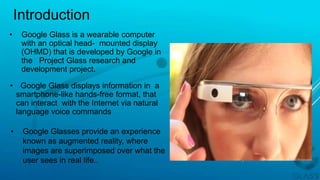 Google Glass is a wearable computer developed by Google with an optical head-mounted display. It displays information in a smartphone-like format and responds to voice commands. Google Glass provides augmented reality by superimposing images over a user's real-life vision. Some key features include taking photos and videos hands-free, getting directions, translations, and messages read aloud. While innovative, challenges include privacy concerns and potential for accidents from visual distraction.
