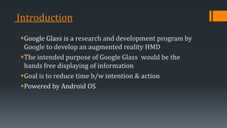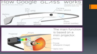 Google Glass is an augmented reality headset developed by Google, designed for hands-free information display and communication using Android OS. It combines several technologies including 4G connectivity, ambient intelligence, and smart clothing, enabling features such as photography, messaging, navigation, and voice command capabilities. While offering advantages like fashionability and assistance for disabled individuals, it also presents concerns regarding privacy, potential accidents, and the risk of damage.