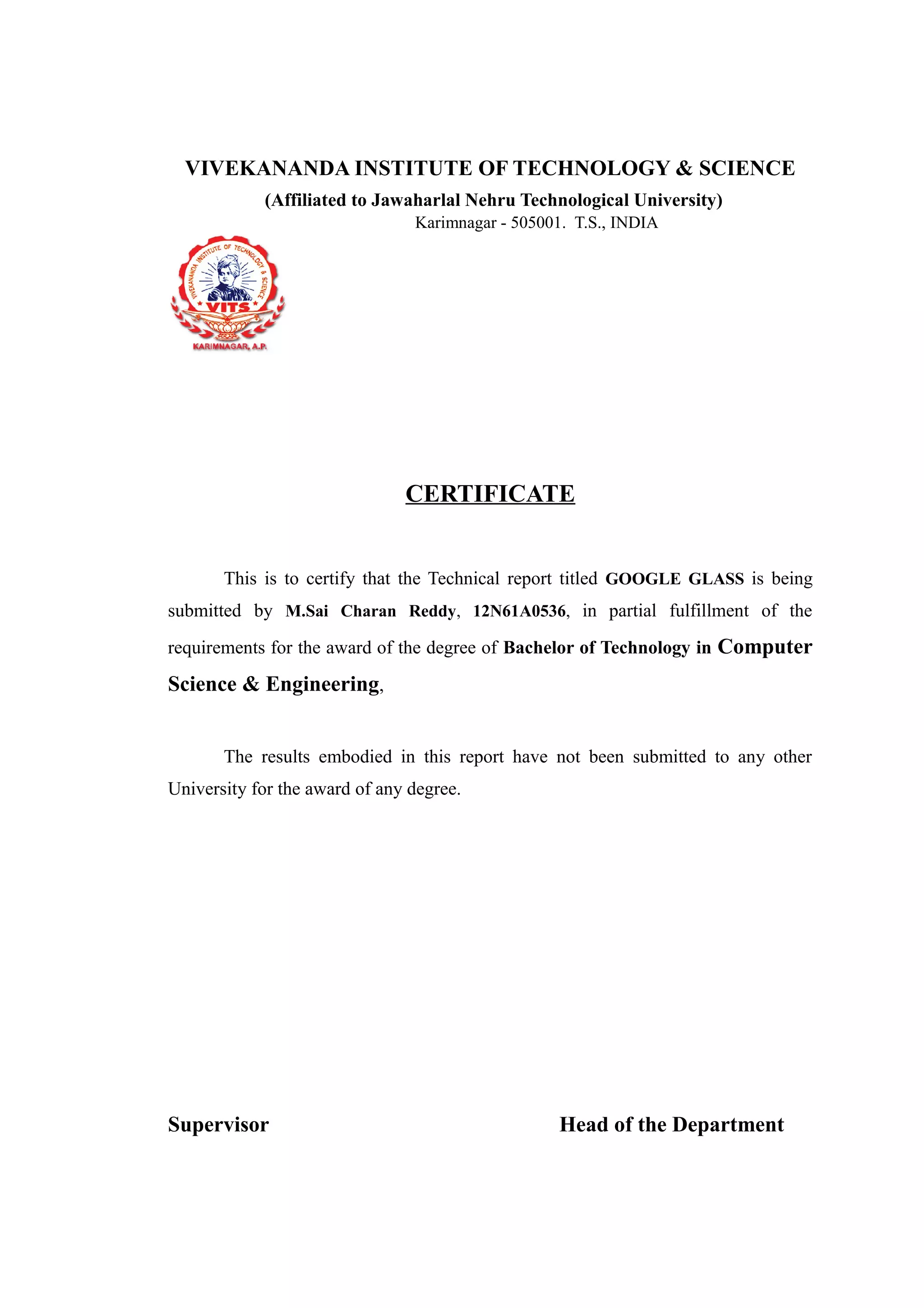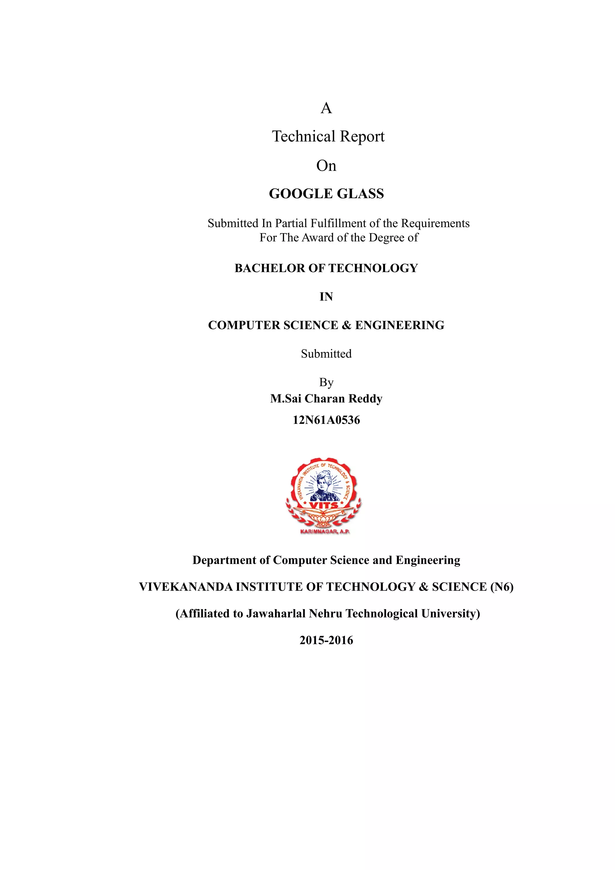 The document provides an overview of Google Glass, including its design features such as the video display and camera, and the technologies that enable it like wearable computing, ambient intelligence, and 4G networks. It also discusses how Google Glass works hands-free using voice commands and displays information to the user through the video display mounted on the glasses. The document serves as a technical report submitted by a student to fulfill the requirements for a Bachelor of Technology degree.