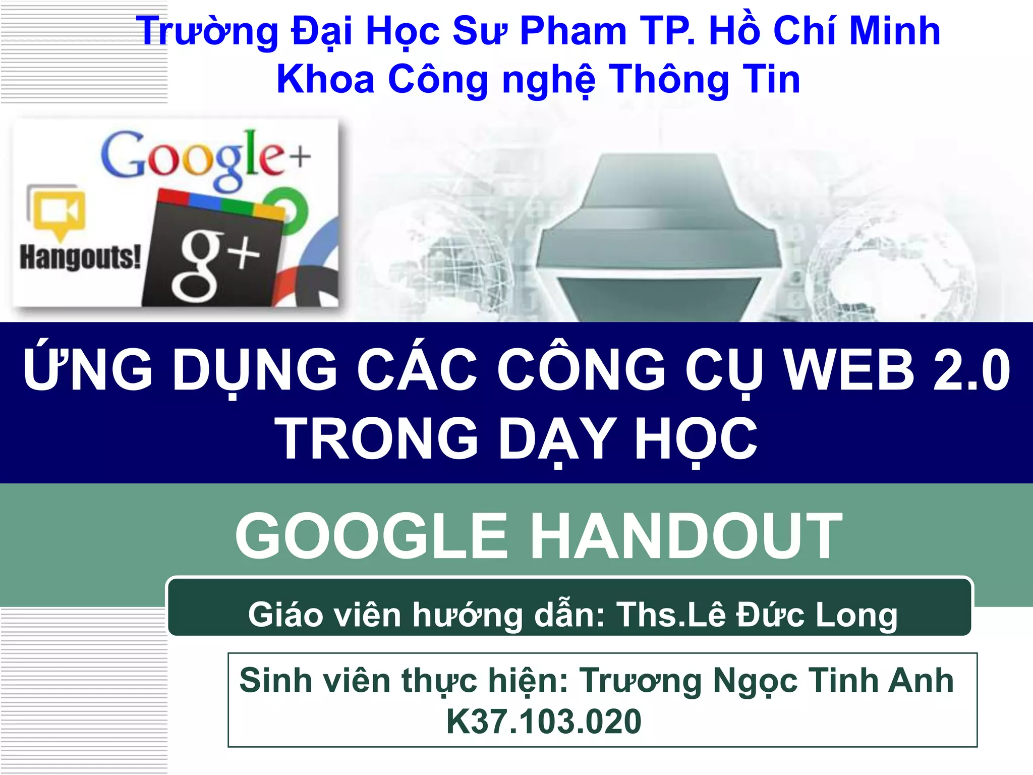 Tài liệu trình bày về Google Hangout, một công cụ video chat do Google phát triển, cho phép nhiều người tham gia cùng lúc và tích hợp nhiều tính năng tương tác. Nó hỗ trợ tổ chức các cuộc họp trực tuyến, với các ứng dụng như ghi âm, quảng cáo và bình chọn, cùng các lợi ích như miễn phí và không cần cài đặt phần mềm. Bên cạnh đó, tài liệu cũng hướng dẫn cài đặt và sử dụng Google Hangout trên nhiều nền tảng.