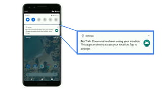 The document discusses features from Google I/O and Android Q, including: