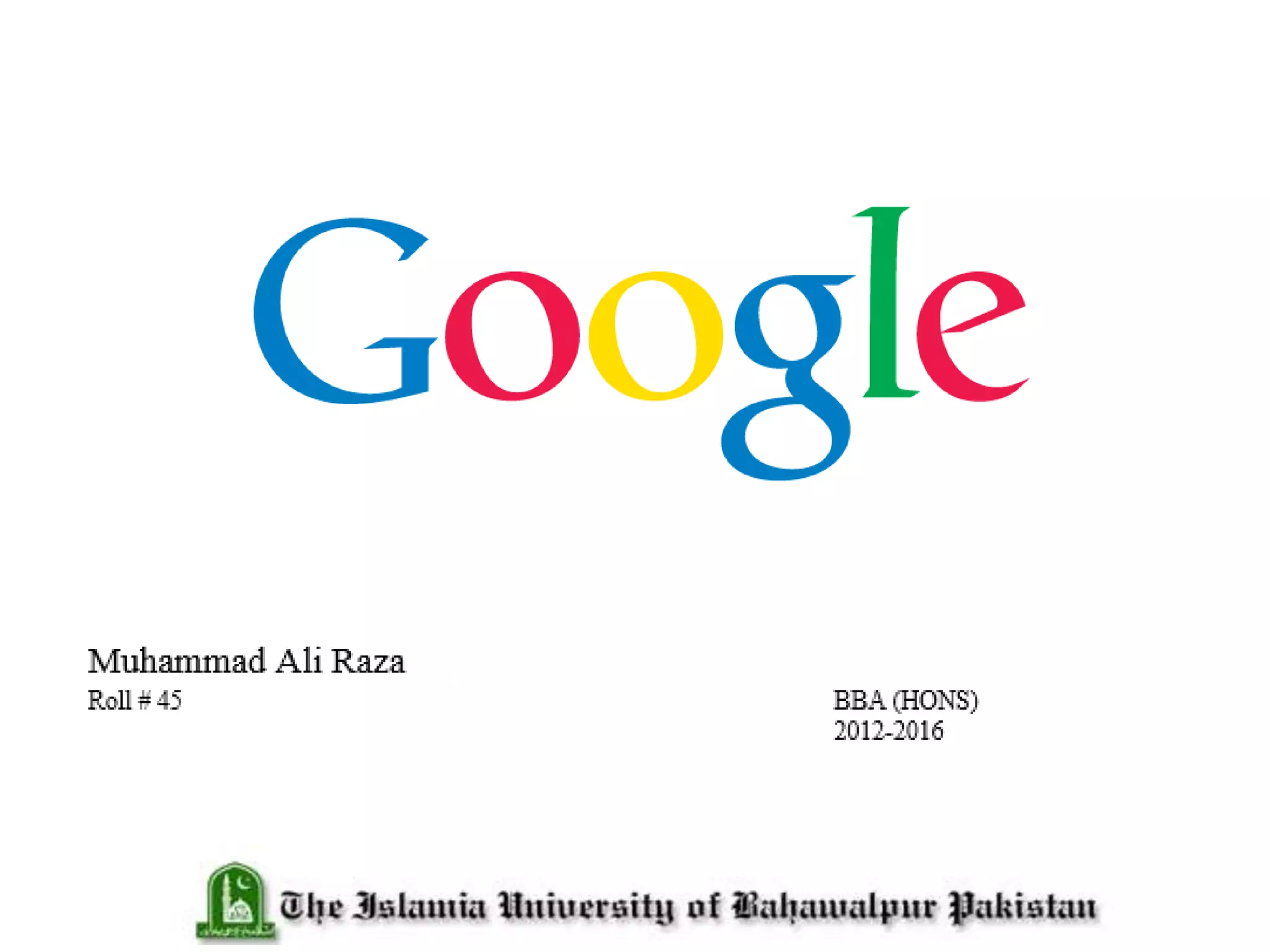 Larry Page and Sergey Brin founded Google in 1995 after developing a search engine called BackRub at Stanford University that used links to determine webpage importance. Google is now a multinational technology company that generates over $50 billion annually in revenue primarily from online advertising and offers various internet-related services and products such as search, maps, Gmail, Android, and YouTube. Google has expanded globally with over 70 offices in more than 40 countries.