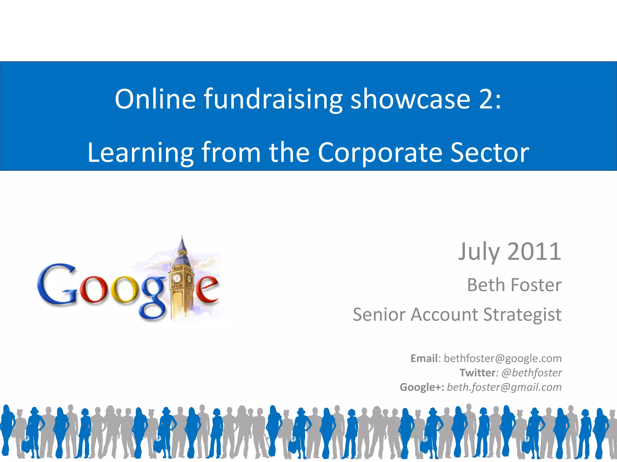 This document provides an overview of online fundraising strategies and lessons that can be learned from the corporate sector. It discusses how technology is changing consumer behavior and interactions, and how businesses must adapt. Some key points include using social media to engage influencers and advocates, analyzing digital marketing campaigns in real-time, and optimizing campaigns for mobile where searches and time spent are increasing. Case studies show how remarketing on Google Display Network helped one company double sales while maintaining ROI.