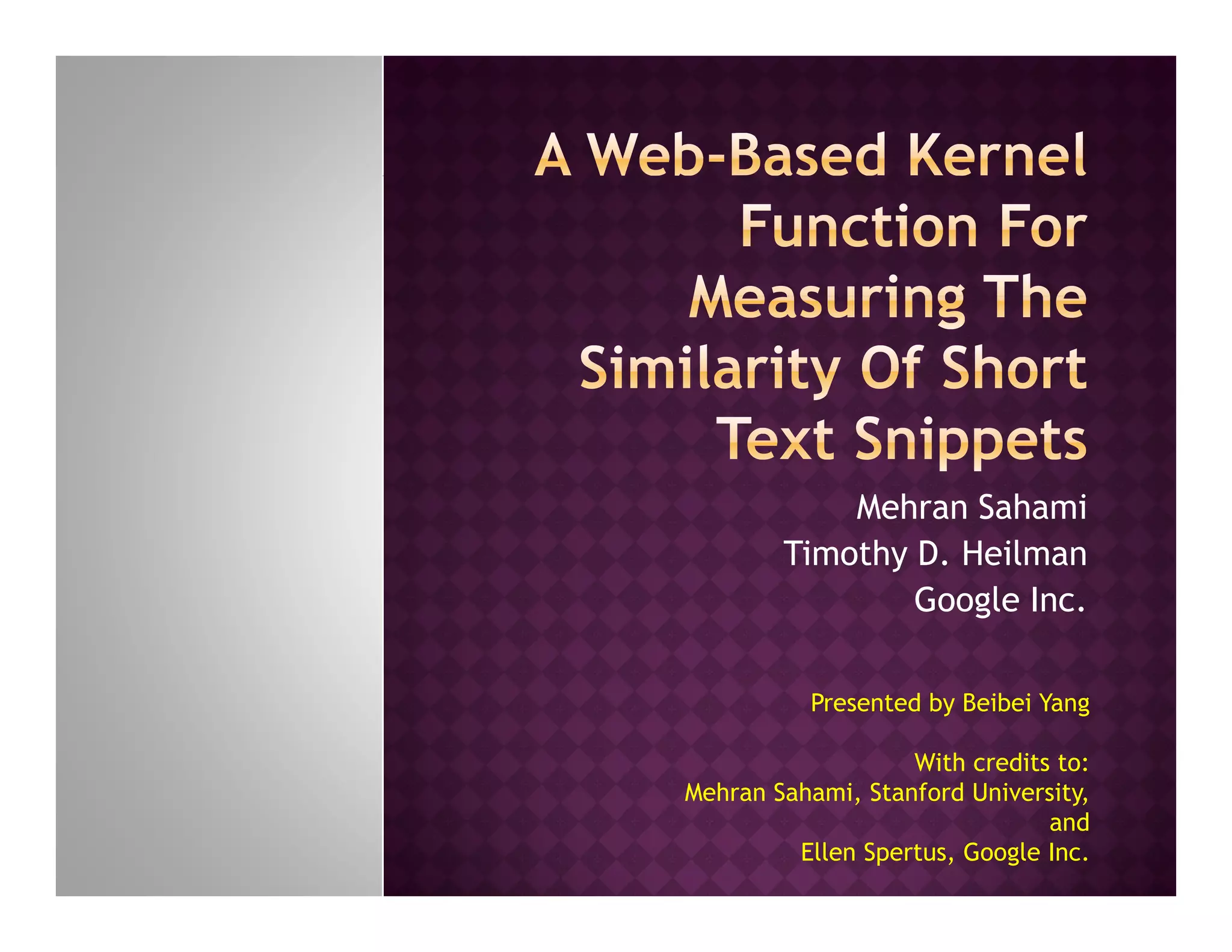 The document discusses semantic similarity and relatedness. It provides examples of how semantic similarity is used in applications like search engines, question answering systems, and making recommendations. It also summarizes several approaches for calculating semantic similarity between words, texts, or documents.