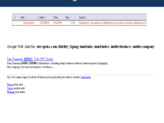 The document provides information about Boolean search operators and modifiers that can be used to refine searches on LinkedIn and other search engines. It discusses the AND, OR and NOT operators and how they can broaden or narrow search results. It also covers the use of parentheses, wildcards, quotation marks and other symbols to effectively search for profiles and information on LinkedIn and beyond. Tips are provided on conducting searches, evaluating results and utilizing additional LinkedIn features and tools.