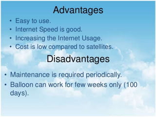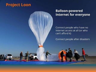 The document discusses Google's Project Loon, which aims to provide internet access using high-altitude balloons equipped with solar panels and technology payloads. It highlights the components of the balloons, their operational altitude in the stratosphere, and current initiatives, including a partnership with Sri Lanka for universal internet coverage. Advantages and challenges of the project are also mentioned along with references for further information.