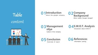 Google was founded in 1998 by Larry Page and Sergey Brin while they were PhD students at Stanford University. It has grown to be the largest search engine in the world. Google promotes a casual and flexible work culture with policies like "20% time" where engineers can spend one day per week working on passion projects. While Google has strengths in its powerful search engine and huge data collection, it also faces threats from competitors in areas like online shopping and voice assistants as well as risks regarding user privacy and data use.