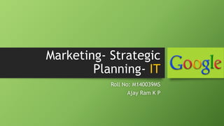 This document provides an overview of Google's business strategies. It discusses Google's founding in 1998, its current dominance in the search engine market with over 87% market share, and its primary revenue source of advertising. It also summarizes Google's product portfolio, vision to organize the world's information, strategic focus on search engine marketing and innovation, and acquisition-based growth strategy. Porter's five forces model and a SWOT analysis are included to assess Google's competitive positioning.