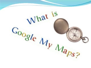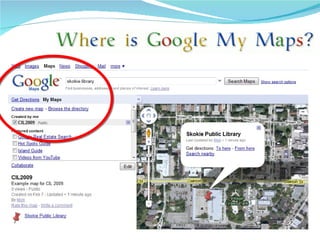 This document provides ideas and examples for creating "My Maps" using Google Maps on a library website. It lists types of maps libraries have created, such as maps showing library branches and bookmobile stops, places of note in the community, and historical maps. It also provides examples of specific library websites that have embedded Google Maps and the kinds of information featured on those maps, such as parks, monuments, and business districts.