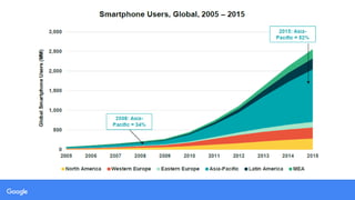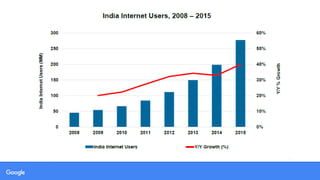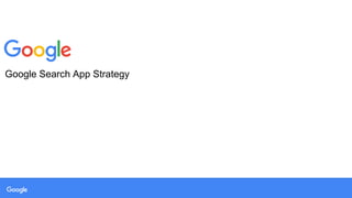 This document discusses Google's search app strategy in India. It notes that India has over 1.3 billion people, with over 1.1 billion mobile connections, 400 million internet users, and 136 million active social media users. 33% of mobile connections are smartphones, and 90% of smartphone users spend their time using apps rather than mobile web browsers. The document outlines Google's goals to improve the user experience on mobile, provide instant one-tap access to information, understand customer behavior, and give localized suggestions. It then describes the features available through Google Search like autocomplete, knowledge graphs, maps, videos and more. Finally, it discusses targeting college students, professionals, and baby boomers across different platforms and with a total advertising