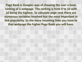Page Rank is Google's system for ranking websites from 0 to 10 based on the number of incoming links, with more links resulting in a higher Page Rank. While Page Rank is constantly updated, the visible ranking is only updated a few times a year. Sites listed in the Google directory can provide a more current estimate of Page Rank, as it lists sites in order of their current ranking. However, Page Rank alone does not impact search engine results or business metrics like traffic or sales. It can help with link exchanges and pricing links for sale on a site, with higher Page Ranks commanding better deals.