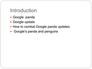 Google periodically releases algorithm updates like Panda and Penguin to improve search quality by lowering the ranks of low-quality, thin, or spammy websites and prioritizing higher-quality sites with original content. The Panda update targets sites with low-value content farms, while combating its effects involves focusing on high-quality, unique content. Both Panda and Penguin aim to resolve issues around low-quality sites in search results.