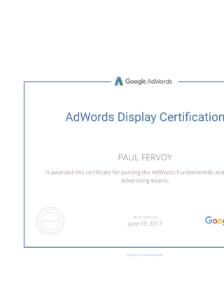 This certificate awards Paul Fervoy for passing Google AdWords certification exams in fundamentals and advertising. The certificate is issued by Google.com/partners and is valid through June 13, 2017.