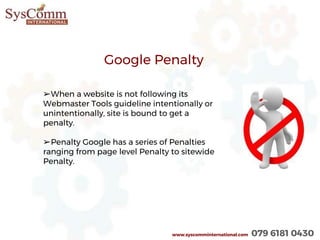 The document discusses Google penalties for violating webmaster guidelines, which can be categorized into on-site and offsite penalties. It outlines steps for recovering from penalties, including identifying bad backlinks, communicating with webmasters, and utilizing Google’s disavow tool. Additionally, it details various algorithm updates, such as Panda and Penguin, and offers strategies for improving website content and link quality.