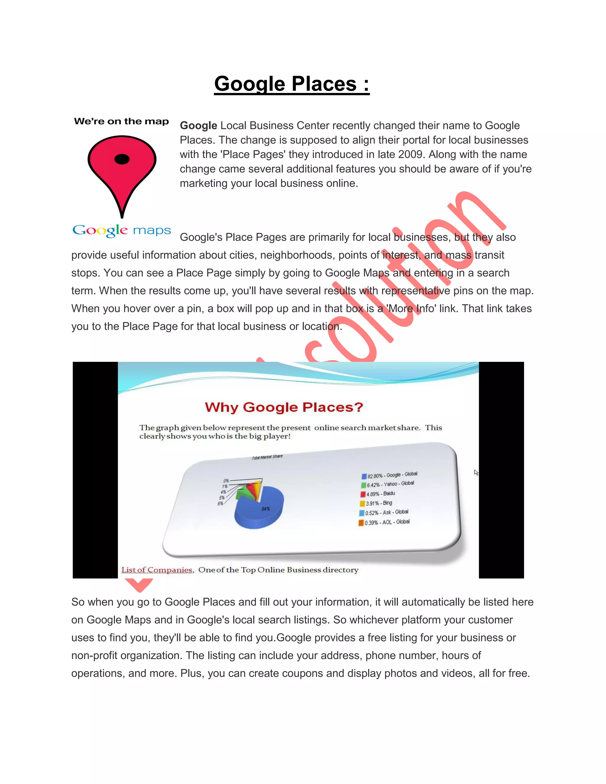 The document discusses Google Places, which is Google's portal for local businesses to claim and manage their listings. It was formerly known as Google Local Business Center. The key points are: