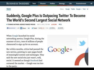 The document discusses how businesses can leverage Google+ for increased sales through tools like authorship, events, and communities. It emphasizes the importance of authorship to enhance online visibility, utilizing Google Calendar for events, and creating communities centered on passions rather than businesses for better engagement. Ultimately, it highlights that these strategies can significantly boost traffic and help businesses connect with their audience more effectively.