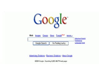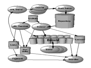 Google is a large-scale search engine that indexes the entire web. It makes use of the link structure between pages to determine importance and provide more relevant search results. The Google search engine consists of three main parts - the Googlebot crawler, the indexer that sorts words and builds a database, and the query processor that returns relevant results in under a second by comparing queries to the index.