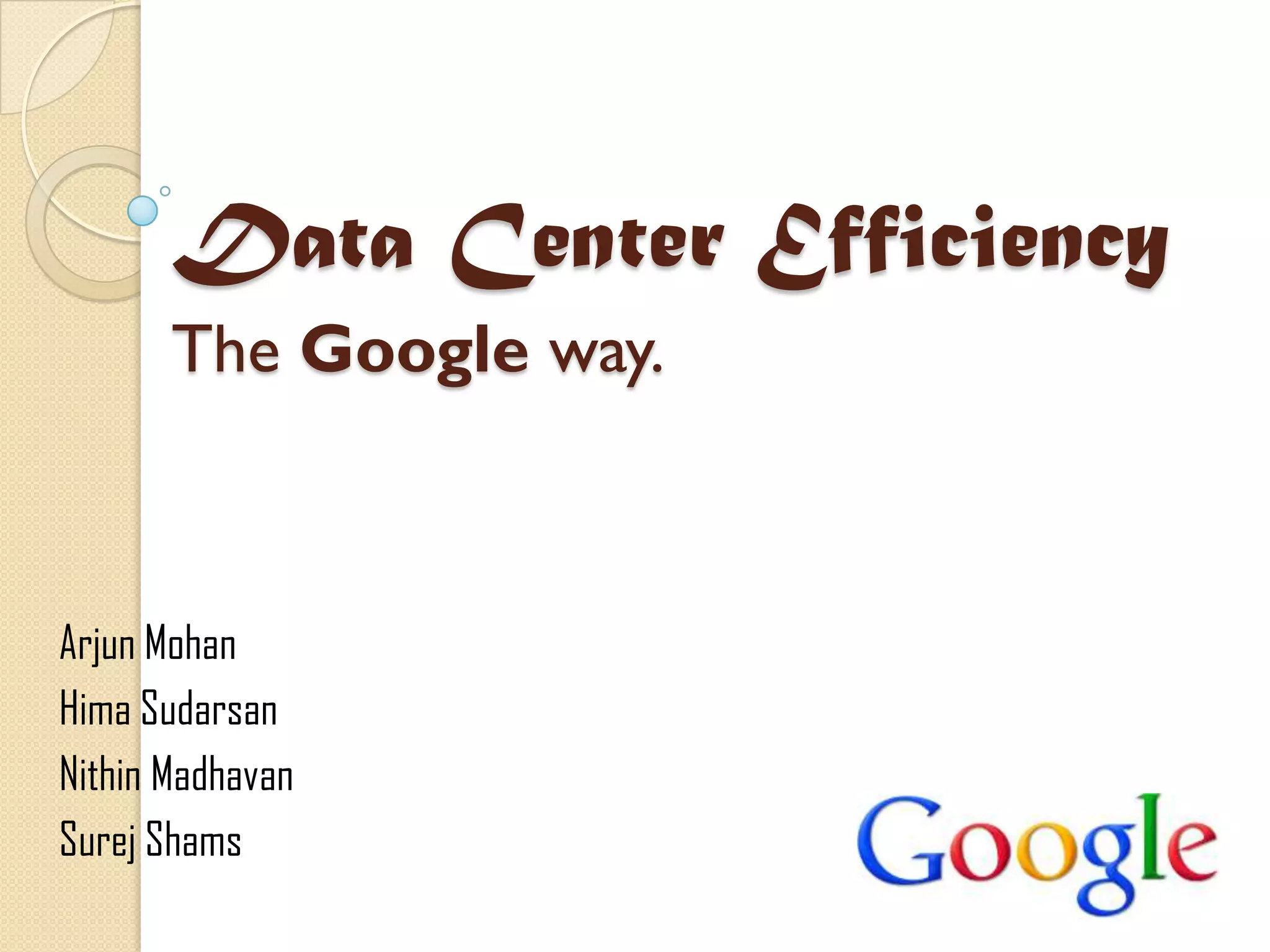 The document discusses data center efficiency and focuses on Google's approach. It covers how Google builds its own custom data centers rather than relying on standard industry equipment and practices. It also describes how Google recommends five methods for reducing power consumption, which include measuring PUE, managing airflow, adjusting thermostats, using free cooling, and optimizing power distribution. The document notes that around 2% of global greenhouse gas emissions result from computing activities, with data centers accounting for 15% of that and large internet data centers making up 5%.