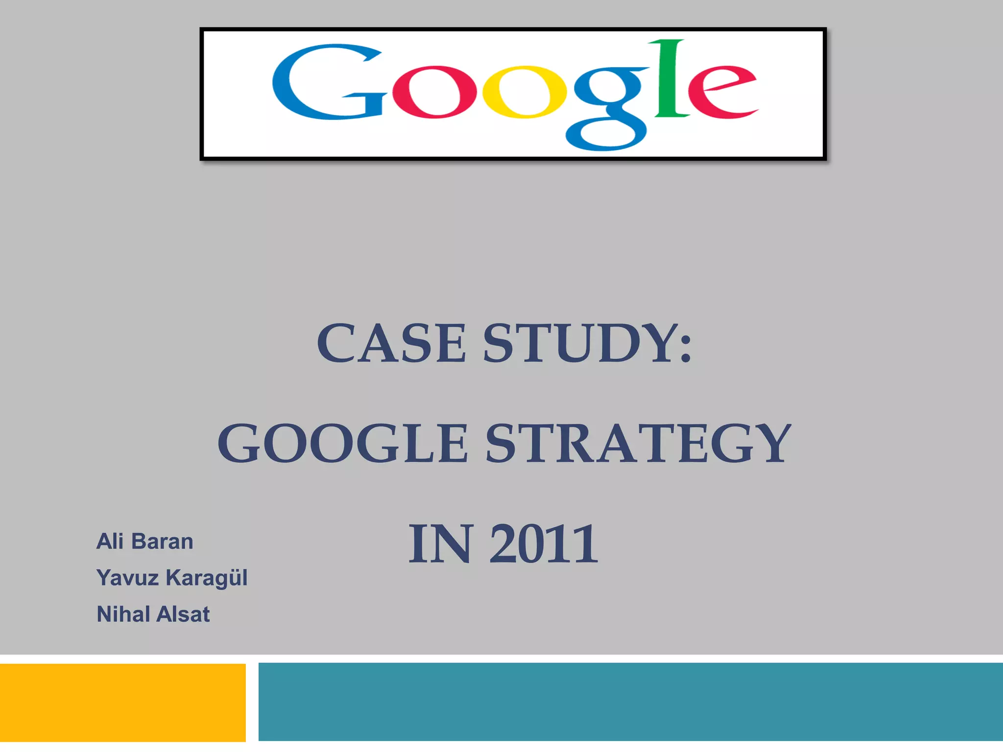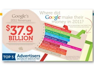 This document provides an overview of Google's business strategies and operations in 2011. It discusses Google's mission to organize the world's information and make it universally accessible. It outlines Google's various products and services in 2011 such as Search, Maps, Gmail, Android, and YouTube. It also examines Google's strategies to dominate internet advertising and control more of the internet through new ventures and expanding advertising channels. Finally, it analyzes Google's competitive position and financial performance in 2011.