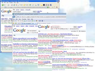 เทคนิคการสืบค้นบนGoogle 1. 2. 3. >>> เทคนิคในการสืบค้น : อันดับแรกให้เลือกใช้คำค้นที่จำเพาะเจาะจง และมีความหมายตรงกับข้อมูลที่ต้องการให้มากที่สุด อาจใช้คำเดียว หรือหลายๆ คำก็ได้ หรืออาจเป็นวลี ( phrase) เช่น distance learning thailand ( โปรแกรมจะทำการค้นทุกคำ และเชื่อมด้วย AND โดยอัตโนมัติ ) และ การคำค้นภาษาอังกฤษ จะพิมพ์อักษรตัวใหญ่หรือเล็กก็ได้ มีความหมายเท่ากัน เช่น DNA, dna, Dna และถ้าต้องการค้นหา ชื่อบุคคล หรือ คำเฉพาะต่างๆ อย่าลืมใส่เครื่องหมายคำพูด ( “…..”) กำกับด้วย 4. 5. >>> Google จะใช้ and ( และ ) อยู่ในประโยคเสมอ >>> ในกรณีที่ต้องการให้ ค้นหาคำใดคำหนึ่งก็ได้ ให้ใช้ OR เชื่อมคำ ( พิมพ์ตัวเชื่อม OR ด้วยอักษรตัวใหญ่ ) เช่น “ travel guide” hongkong OR singapore 6. >>> Google จะละคำทั่วๆไป หรือคำประเภท commond word ( เช่น the, to, of a , an) และตัวอักษรเดี่ยว เพราะจะทำให้ค้นหาช้าลง แต่ถ้าคำพวกนั้นสามารถช่วยให้หาข้อมูลง่ายขึ้น ก็ต้องใช้เครื่องหมาย + ช่วยโดยนำไปอยู่หน้าคำนั้น ( ต้องเว้นวรรคก่อนด้วย ) เช่น back +to nature หรือ final fantasy +x >>> ค้นคำพ้อง โดยใช้เครื่องหมาย ~ (tilde) เช่น ~food ~facts เพื่อค้นหาเรื่องที่เกี่ยวกับ food facts, nutrition facts, cooking information >>> ถ้าไม่ต้องการให้คำใด ให้ใส่เครื่องหมาย – นำหน้าคำนั้นแล้วตามด้วยเครื่องหมาย / เช่น ต้องการค้นคำว่า virus ซึ่งหมายถึงเชื้อไวรัส ที่ไม่ใช่ไวรัสคอมพิวเตอร์ virus – computer/ 7. >>> ปุ่ม “ I’m feeling lucky ” หรือ “ ดีใจจัง ค้นแล้วเจอเลย ” เป็นการสั่งให้ค้น และแสดงผลตรงไปที่เว็บไซต์ซึ่งตรงกับคำค้นมากที่สุด เพียงเว็บไซต์เดียว เพื่อความสะดวกรวดเร็ว เช่นพิมพ์คำค้น stanford จะได้ผลการค้นเป็นเว็บไซต์ที่มีความหมายตรงที่สุด คือ Stanford University Homepage 8. >>> การค้น Domain Search ระบุให้ค้นเฉพาะภายใน domain ที่ต้องการเท่านั้น ให้ใช้ site: <domain name> เช่น ต้องการค้นหาข้อมูลเกี่ยวกับการรับเข้าศึกษาต่อ ภายในเว็บไซต์ของมหาวิทยาลัยสแตนฟอร์ด admission site: www.stanford.edu หรือ admission site:www.su.ac.th 9. >>> Who Links To You? ต้องการทราบว่ามีเว็บเพจใดบ้างที่ทำ link เชื่อมโยงมาที่เว็บไซต์นี้ โดยใช้คำสั่ง link:<siteURL> ตัวอย่างเช่น link:www.google.com 10. >>> พยากรณ์อากาศ ของเมืองต่างๆ ทั่วโลก ( ภายในช่วงระยะเวลา 4 วัน ) ให้ใช้ weather เช่น weather Bangkok หรือ weather London 11. >>> ค้นหาภาพ โดยใช้ Google Image Search โดยเฉพาะ หรืออาจใช้วิธีพิมพ์คำว่า pics หรือ pictures ต่อท้ายคำค้นก็ได้ เช่นหาภาพพระอาทิตย์ตก ใช้คำค้นว่า sunset pictures หรือ sunset pics 12. >>> พจนานุกรมฉบับ Google อีกความสามารถของ google คือ การค้นหาความหมายหรือ คำจำกัดความของคำศัพท์ (definition ) ของคำศัพท์นั้น ด้วยคำบังคับว่า define แล้วตามด้วยคำศัพท์ที่ต้องการ เช่น define blog เป็นต้น blog เป็นคำย่อของ Weblog 13. >>> หาไฟล์ในรูปแบบอื่นๆที่ไม่ใช่ HTML Google สามารถหาไฟล์ในรูปแบบอื่นๆที่ไม่ใช่ HTML ได้ประเภทไฟล์ที่รองรั