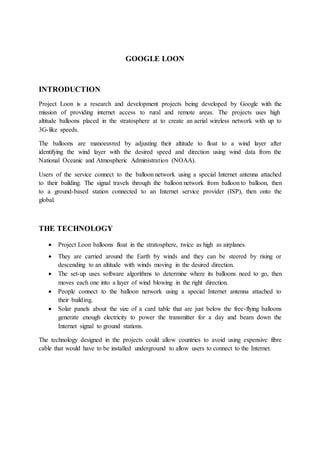 Project Loon is a Google project that aims to provide internet access to rural and remote areas using high-altitude balloons placed in the stratosphere. The balloons create an aerial wireless network with speeds of up to 3G. They are manoeuvred by adjusting their altitude to float on wind currents identified using NOAA wind data. Users connect to the balloon network using a special antenna, and the signal travels between balloons and to ground stations connected to ISPs. If successful, this technology could provide internet access without expensive fiber cable infrastructure.