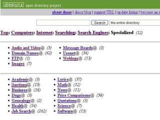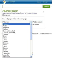 This document provides an overview of search engines and how they work. It discusses the major components of search engines including spiders that crawl websites to index their content, the indexing process that analyzes websites and stores essential information, and the search engine program that matches user queries to indexed content. It also describes common search options available on most search engines like phrase searching, boolean operators, and searching by date or file type. Finally, it discusses related tools like meta search engines, desktop search programs, and ways to stay up-to-date on search engine developments.