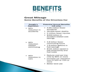 The Google driverless car project involves developing technology for autonomous vehicles. The Google cars can steer, accelerate, brake and obey traffic laws without human input using sensors and software. Over 1 million miles have been driven accident-free. While driverless cars promise benefits like increased safety, traffic and environmental issues remain regarding regulations, liability, public acceptance, and infrastructure changes needed for full adoption of the technology.