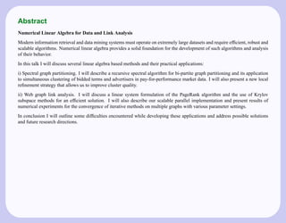 The document discusses the role of numerical linear algebra in improving data and link analysis, focusing on methods like spectral graph partitioning and web graph link analysis. It details practical applications such as clustering of advertisers and bidded terms in market data and introduces Krylov subspace methods for efficient solutions in algorithms like PageRank. The speaker also highlights implementation challenges and future research directions.