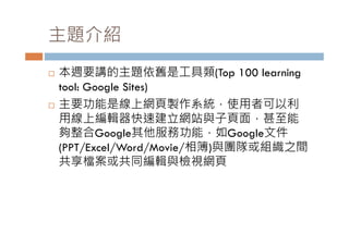 本週要講的主題依舊是工具類(Top 100 learning 本週要講的主題依舊是工具類 tool: Google Sites) 主要功能是線上網頁製作系統,使用者可以利 用線 編輯器快速建 網站與子頁面 甚 能 用線上編輯器快速建立網站與子頁面,甚至能 夠整合Google其他服務功能,如Google文件 (PPT/Excel/Word/Movie/相簿)與團隊或組織之間 共享檔案或共同編輯與檢視網頁