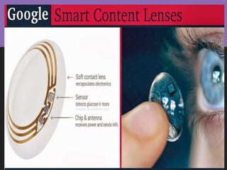 The document describes Google's smart contact lens, which contains a glucose sensor and wireless chip embedded between soft lens materials. The sensor measures blood sugar levels through tear fluid, while the wireless antenna safely transmits information outside the eye. These smart contact lenses could help people with diabetes by continuously and closely monitoring glucose levels in tears without pain.