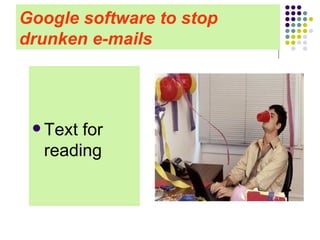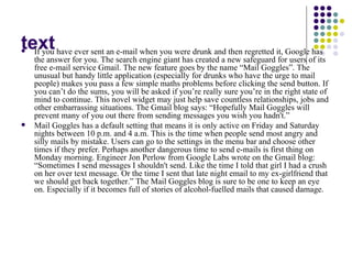 The document discusses a new feature created by Google called "Mail Goggles" that aims to prevent users from sending regretful emails while intoxicated. Mail Goggles is an application for Gmail that makes users solve simple math problems before being able to send a message late at night on weekends, when drunken emails are most common. It is meant to give users a pause to reconsider potentially embarrassing emails to exes, bosses, or others that may damage relationships or careers. The feature was inspired by a Google engineer who regretted drunk texts and emails to past romantic interests.