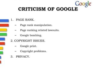 Google began in 1996 as a research project by Larry Page and Sergey Brin. It has grown to be a dominant search engine and digital advertising company. Google makes most of its revenue from targeted advertising based on users' search queries and browsing history. It faces competition in search from other companies and has faced some criticism over privacy and censorship issues. Going forward, Google continues focusing on innovation through new products and services like those in Google Labs.