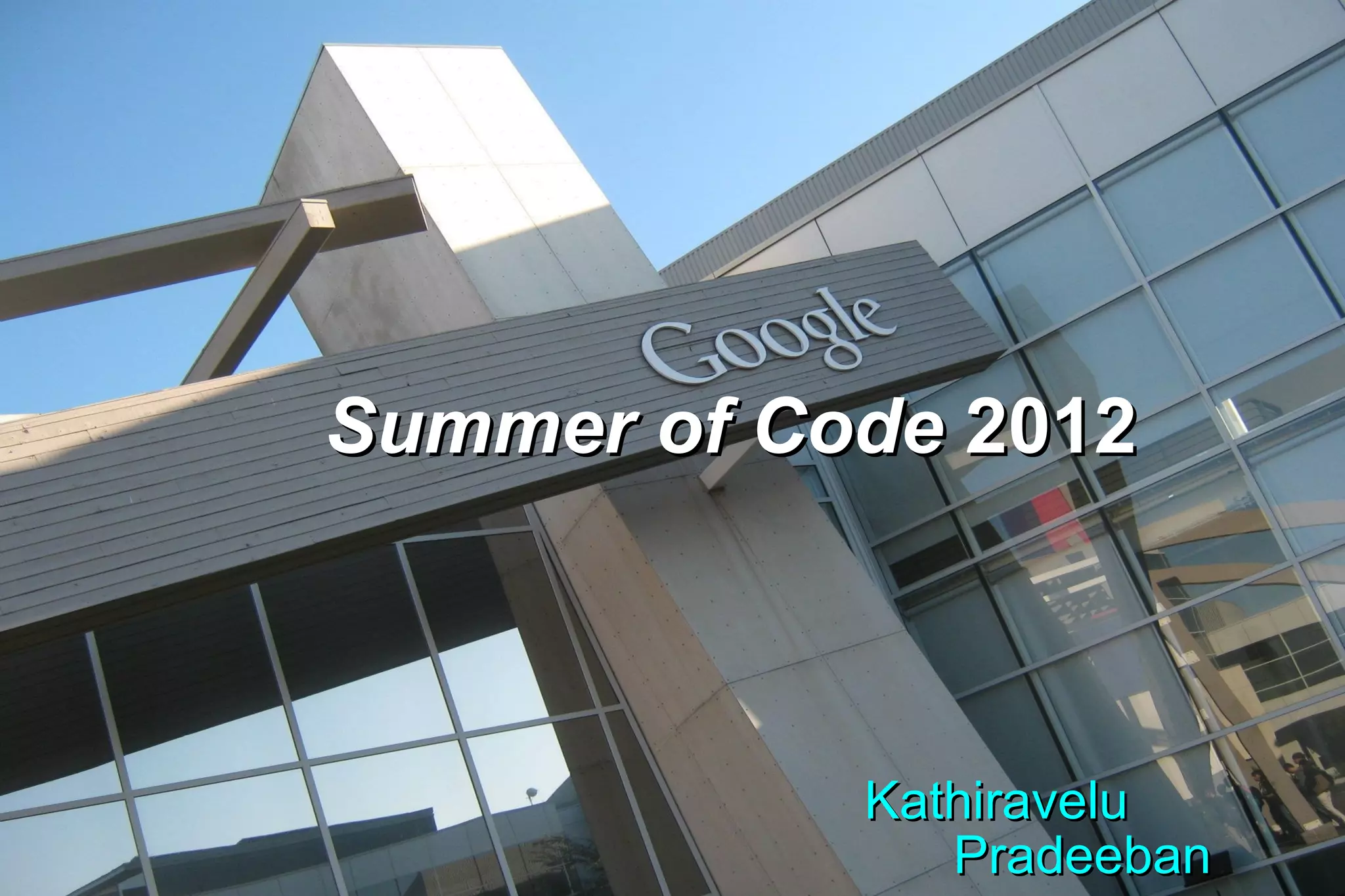 Google Summer of Code is a program where university students can work with open source organizations over the summer. Students are paired with a mentor from an organization and work on a proposed project over 3 months. Students are evaluated at milestones and can earn up to $5,500 if their project is successful. The document provides details on finding a project, writing a proposal, the timeline, communication best practices, and concludes by wishing students the best of luck.