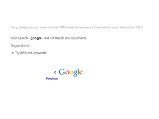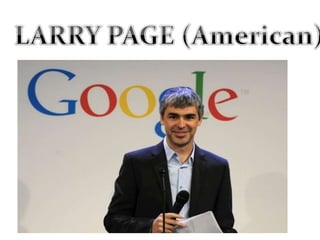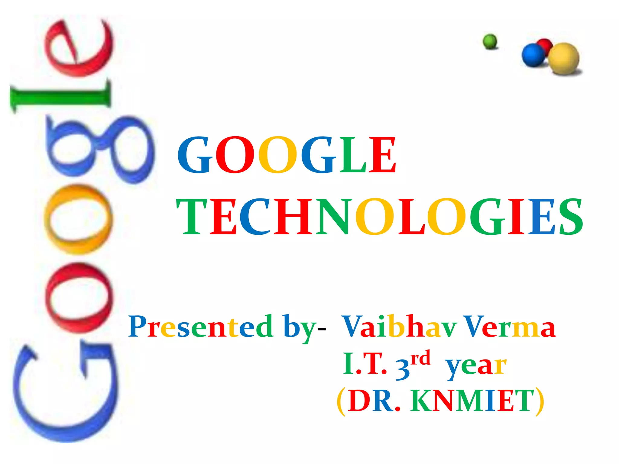 Larry Page and Sergey Brin met at Stanford University in 1995 and created a search engine called Backrub in 1996 that was later renamed Google in 1997. Google launched its homepage in 1998 and redesigned its logo in 1999. It has since expanded into many other products and services, grown tremendously, and now processes over 20 petabytes of data daily with over 2,668 employees. Google aims to build the ultimate search engine that understands users' needs precisely through its technology.