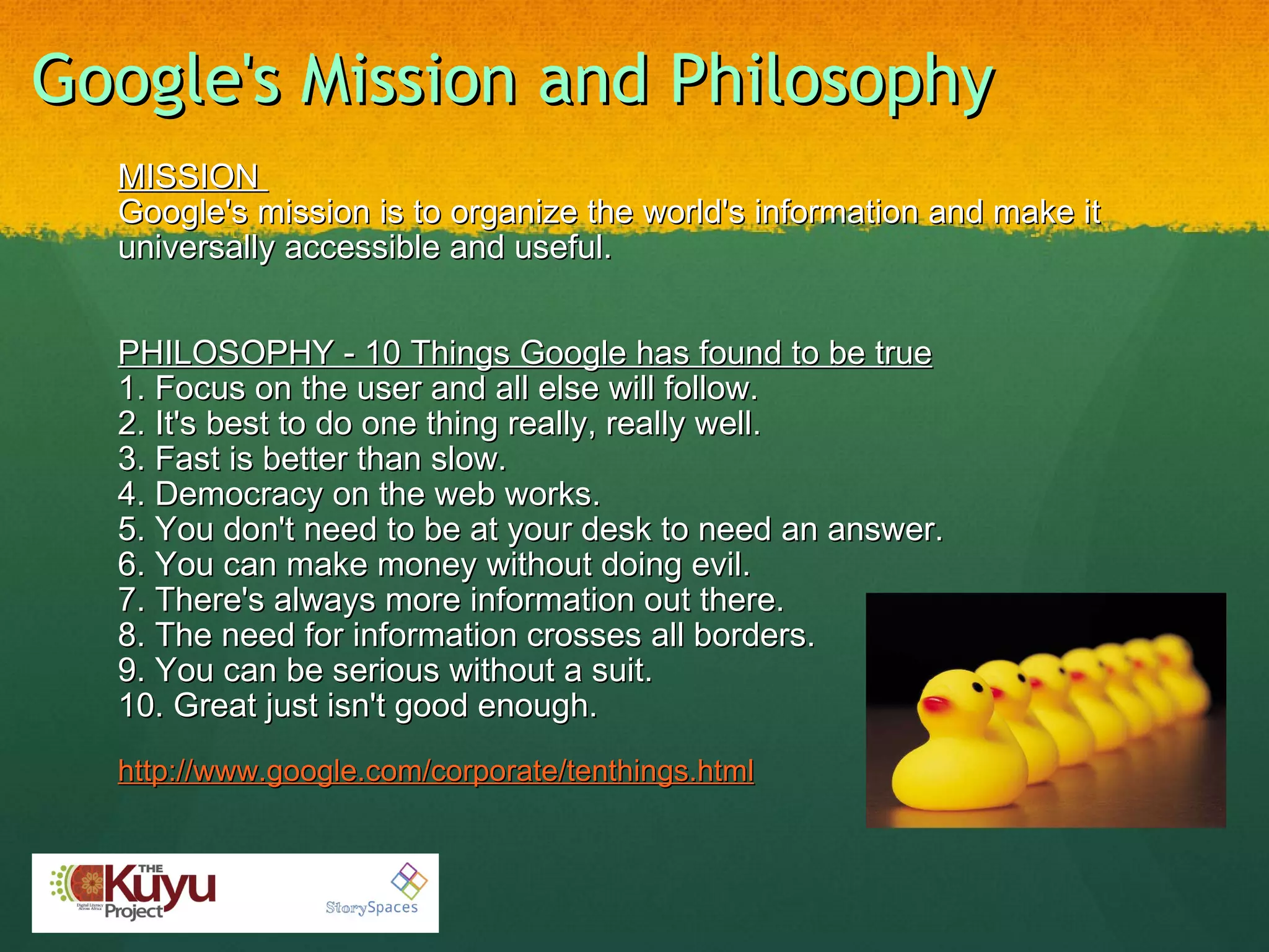 Google's mission is to organize the world's information and make it universally accessible. It offers a suite of free applications including Gmail, Docs, Calendar, and Sites for non-profits to communicate, collaborate and share information online without downloads or maintenance. Google Docs allows real-time collaboration on documents, spreadsheets and presentations from any internet connection.