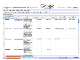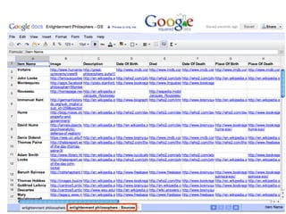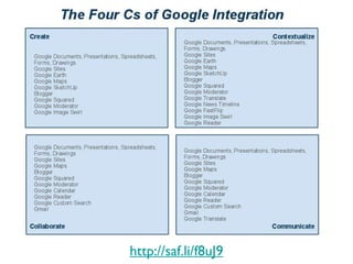 The document provides an overview of various Google tools and their potential uses for instructional strategies and collaboration. It describes how documents, presentations, spreadsheets, forms, drawings, and sites can be used to embed media, link assignments, and facilitate collaboration. Other tools like Reader, Calendar, Translate, and moderators are mentioned as ways to share resources, organize tasks, and engage learners. The document emphasizes using these tools to transform traditional assignments into authentic publishing and collaborative learning experiences.