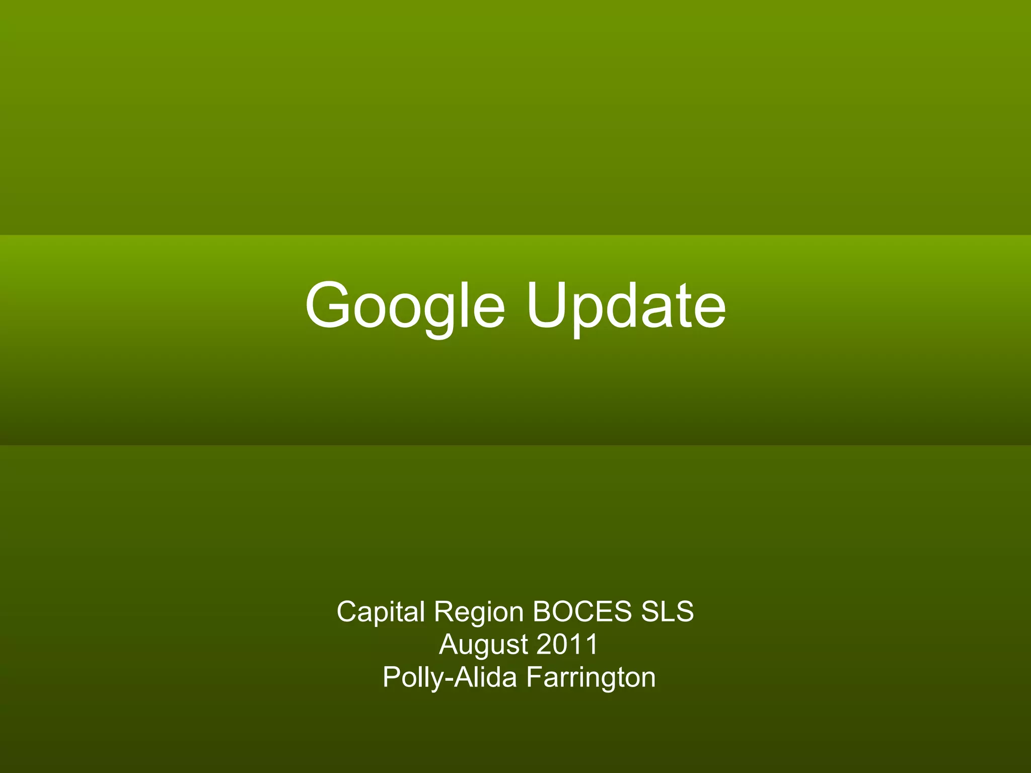 This document provides an overview of Google products and services for educators, including Google accounts, Google+, Google search features, Google Maps, Google Earth, Google Docs, Google Sites, Google Books, and other Google apps. It highlights specific education uses and resources for each tool, such as customizing Google search, using Google Maps for field trips, creating surveys with Google Forms, and building websites with Google Sites.