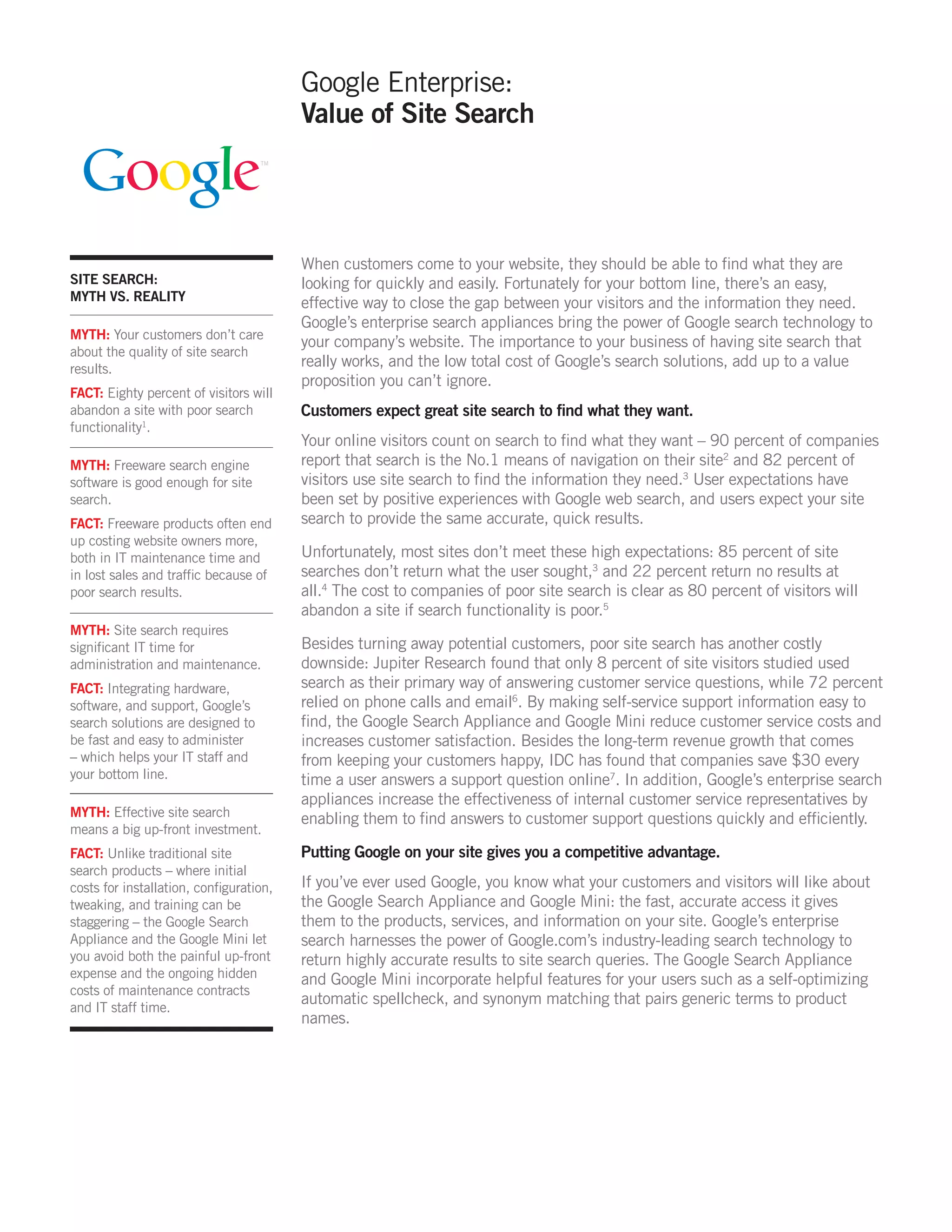 Google's enterprise search appliances provide accurate and fast site search results that improve the customer experience. Poor site search can cause 80% of visitors to abandon a site, while effective search increases sales and reduces customer support costs. Google's plug-and-play appliances are easy to deploy, require no ongoing maintenance fees, and cut IT overhead compared to other search solutions.