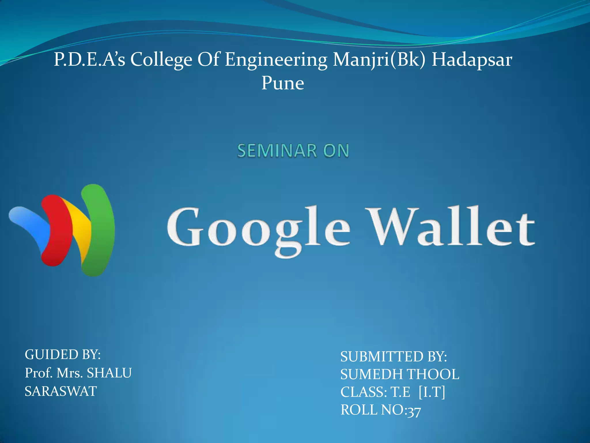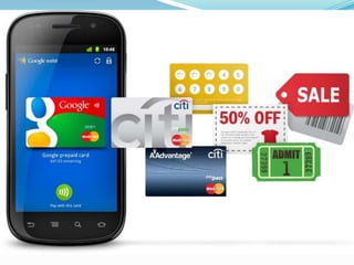 Google Wallet is a mobile payment system that allows users to store debit, credit, loyalty and gift cards on their mobile phone. It uses Near Field Communication (NFC) technology to make secure payments simply by tapping the phone on a PayPass-enabled terminal. Google Wallet stores encrypted versions of payment cards on secure servers and transmits only what is needed for each transaction, keeping users' actual card details private. The app provides a fast, convenient way to pay that saves users from carrying multiple physical cards and takes advantage of digital coupons and deals.