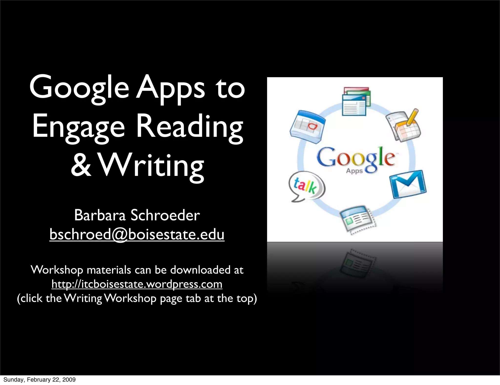The document presents a workshop on using Google Apps to enhance reading and writing engagement in education, led by Barbara Schroeder. It highlights the benefits of Google Docs for collaborative writing, Google Sites for class resources, and Blogger for authentic student voices, providing various classroom ideas and tips for implementation. Additionally, it includes links to workshop materials and tutorials for further exploration.