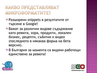 До скоро битувашемит, че микроформатите не се изпълняват в Google.bg Поради тази причина... никой не се е занимавал да ги имплементира. Или почти никой. Истината е, че доказано от месец октомври (най-късно), микроформатите важат за български страници и се показват в google.bg
