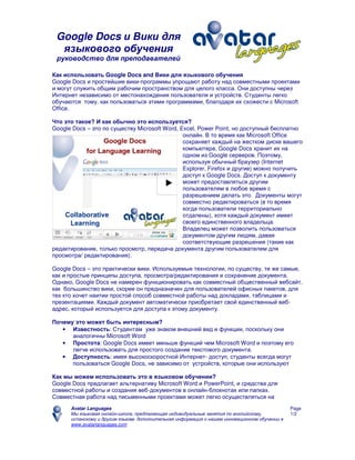 Документ представляет собой руководство для преподавателей по использованию Google Docs и вики в языковом обучении. Подчеркивается, что эти инструменты облегчают совместную работу студентов и преподавателей, позволяя редактировать документы в реальном времени и отслеживать изменения. Также рассматриваются преимущества, такие как доступность, простота использования и мультиязычная проверка орфографии.