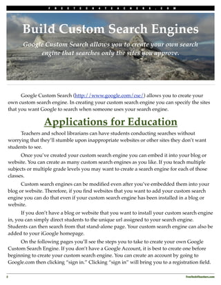 This document provides instructions for teachers on how to create a custom Google search engine using Google Custom Search. It explains that custom search engines allow teachers to specify which websites students can search from, avoiding inappropriate content. The 9-step process for making a custom search engine is outlined, including choosing sites, layout, and removing ads. Teachers can then embed the search engine into their blog or website, or use it as a standalone page. Additional steps are provided for installing the search engine within a Blogger blog.