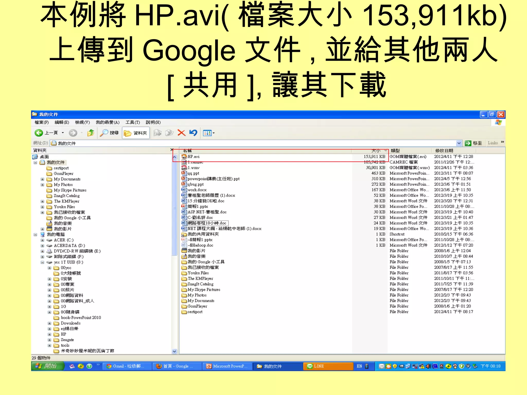 收 到共用的通知 , 並將其下載 本例cicdjason@gmail.com帳 號 ,Google 文件內已有 HP.avi 設定給cmtycc@gmail.com帳號共 用