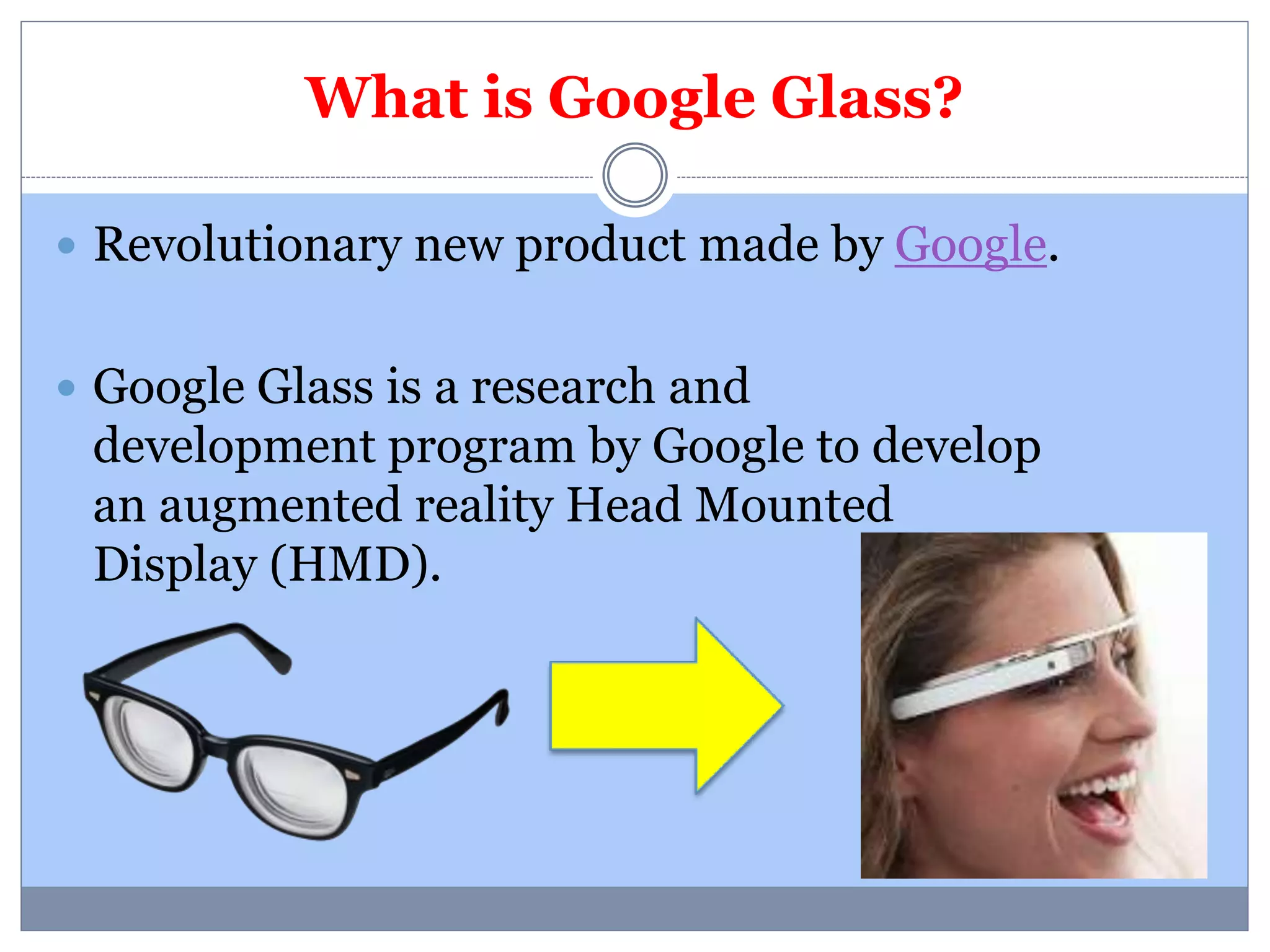 Google Glass is an augmented reality head-mounted display developed by Google to provide information to the user via an optical head-mounted display. It has a small display, camera, speaker, and can be controlled via voice commands. Google Glass aims to provide hands-free access to information and allow for new forms of communication through technologies like augmented reality.