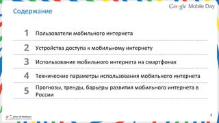 Документ анализирует состояние мобильного интернета в России на конец 2012 года, охватывая количество пользователей, стоимость трафика и устройства доступа. Прогнозируется рост числа пользователей до 79,1 млн к 2013 году и увеличение трафика в четыре раза в ближайшие два года. Также представлен портрет пользователей смартфонов и составлен обзор рынка мобильных устройств.