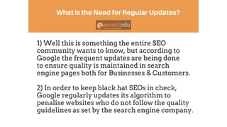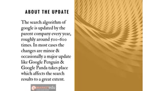 - Google has released several algorithm updates since 2011, including Google Panda, Penguin, Pigeon, and Hummingbird, to prioritize high-quality websites and reduce spammy sites in search results.